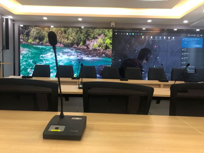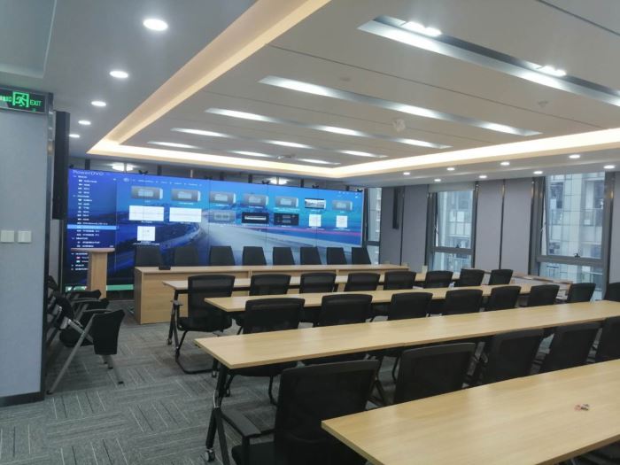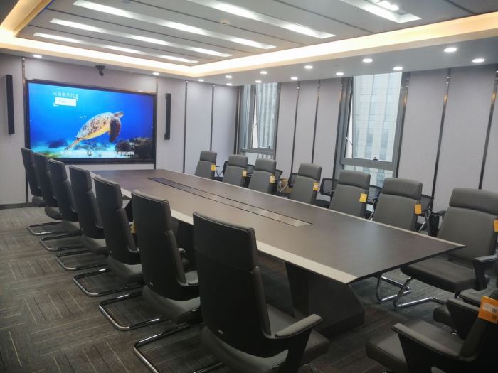 该项目从装修设计、办公桌椅、施工、产品安装调试整体打包,多功能会议室采用全球最先进液晶拼接显示系统巴可Unisee ,拼接方式:3*5,可视化控制系统采用分布式协作系统,BIAMP音频控制器、松下4k超高清会议摄像机、beyerdynamic无线会议话筒、华为视频会议系统、 海信会议平板、MKlen会议音箱。