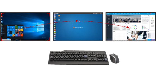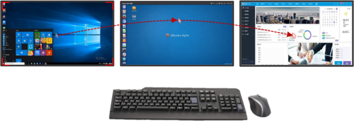 每个坐席均配置多台显示器,为了简化操作,分布式系统支持一套鼠标键盘操控多台主机:坐席端可以通过分布式软件对受控的屏幕按组划分,通过坐席端的显示器多行、多列的不同摆放形式进行对应匹配的设置;设置完成后,即可通过一套鼠标键盘管理、控制坐席端的全部屏幕,实现鼠标和键盘的跨屏、漫游。单个坐席可实现任意组合(任意行×任意列)的坐席端屏幕的跨屏漫游操作,坐席端可以轻松实现多屏幕显示操作的应用场景。