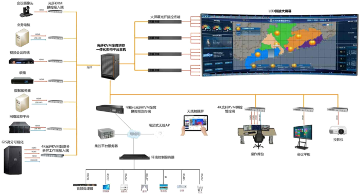 光纤KVM坐席拼控一体化架构平台,采用纯FPGA架构、将光纤作为传输介质,以非TCP/IP传输方式,通过电力信息化系统数据集中整合;后台业务实时监控,告警自动弹窗处理;多部门协同办公,权限严格管控;坐席战时操作软件;单屏四画面分割;业界独有的双屏一纤传输。