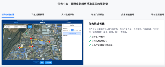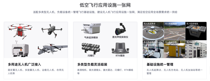 低空飞行应用平台,基于低空云提供的低空数据、低空计算、低空管控等能力,通过整合无人机硬件、管理调度软件、飞行与图像算法,构建集调度、管控、应用、运营于一体的飞行应用服务平台,以市场化服务模式提供航摄采集、智能巡检、物流配送等标准化服务,满足大自然资源、城市治理等场景下的低空业务需求。