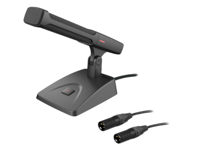 此款AI手拉手会议系统是一款双音头双路备份式拾音设备,搭载两枚 20.2mm拾音头,分别配以独立工作的放大线路。话筒内配置有超心型指向的拾音头,设有双层防风罩,可有效减低环境声及风声。话筒座设有无噪开关,同时控制双路开关,并内置 LED 显示灯,亮起时显示拾音状态。话筒外壳为全金属结构,锌合金一体成型外壳,有效抑制各类电磁干扰,话筒底部以活动结构连接在底座上,可灵活调校收音位置。话筒座底部设有低切开关,它的主要作用是有效降低低频噪音,切除近讲效应,减少爆破音,以及去除不必要的低频,使声音更加干净明亮,提高语音清晰度,更加适合系统混音。话筒还具备增益开关,当信号经过话筒增益器时,其电平会被放大,使得后续的处理设备(如调音台、录音机等)能够更准确地捕捉和记录声音。这样不仅可以保证音频信号的质量,还能在录音或现场扩声等场合中,确保声音信号的强度和清晰度满足需求。